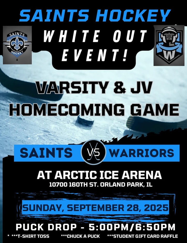 Bring your Saints spirit, pack the rink, and cheer on both teams as they battle for victory! Letβs make this an inaugural Homecoming to remember.